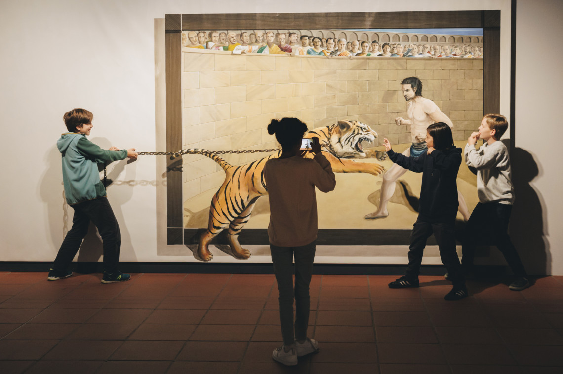Die Ausstellung „Rom lebt!“ lädt Groß und Klein dazu ein, auf unterhaltsame Weise in das Leben der alten Römer einzutauchen. Insgesamt 16 großformatige, aufwendig gestaltete 3D-Szenen zeigen Alltagssituationen aus der Antike – vom Wellness in den römischen Thermen bis zur Tierhetze in der Arena.