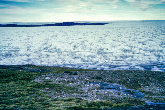 Dieses Foto einer Gletscherzunge in Westgrönland könnte auch den Blick vom Blender über den Illergletscher zum Kempter Wald zeigen. Im Hintergrund oben links wäre dann der eisfreie Haarberg zu erkennen. In der Mitte des Eises stellen wir uns die Gegend um Kempten vor. Sie war unter dem an dieser Stelle rund 350 Meter dicken Gletschereis begraben. Foto: Herbert Scholz